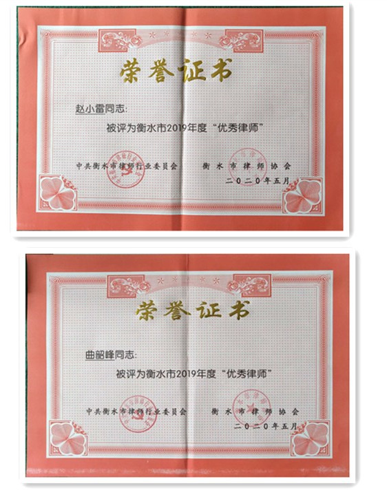 我所曲韶峰、赵小雷二名律师被中共衡水市律师行业委员会、衡水市律师协会评为“衡水市2019年度优秀律师”。